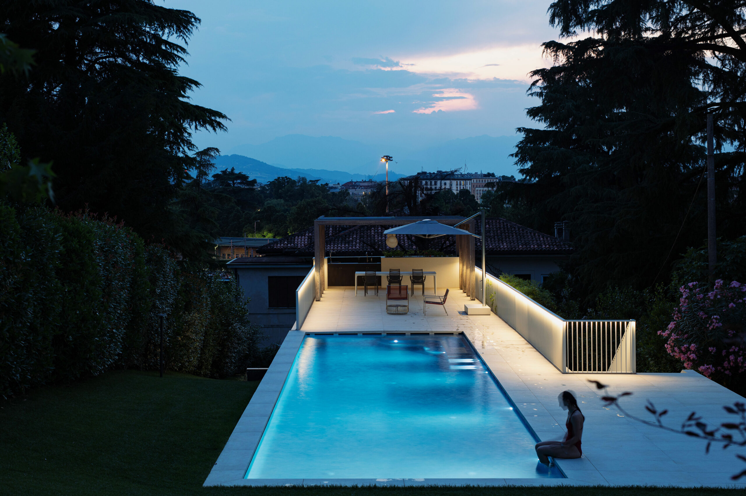 Una piscina panoramica sulle colline di Monte Berico sfrutta la pendenza del giardino per collocare sotto di essa una piccola guest house indipendente a supporto della casa principale.