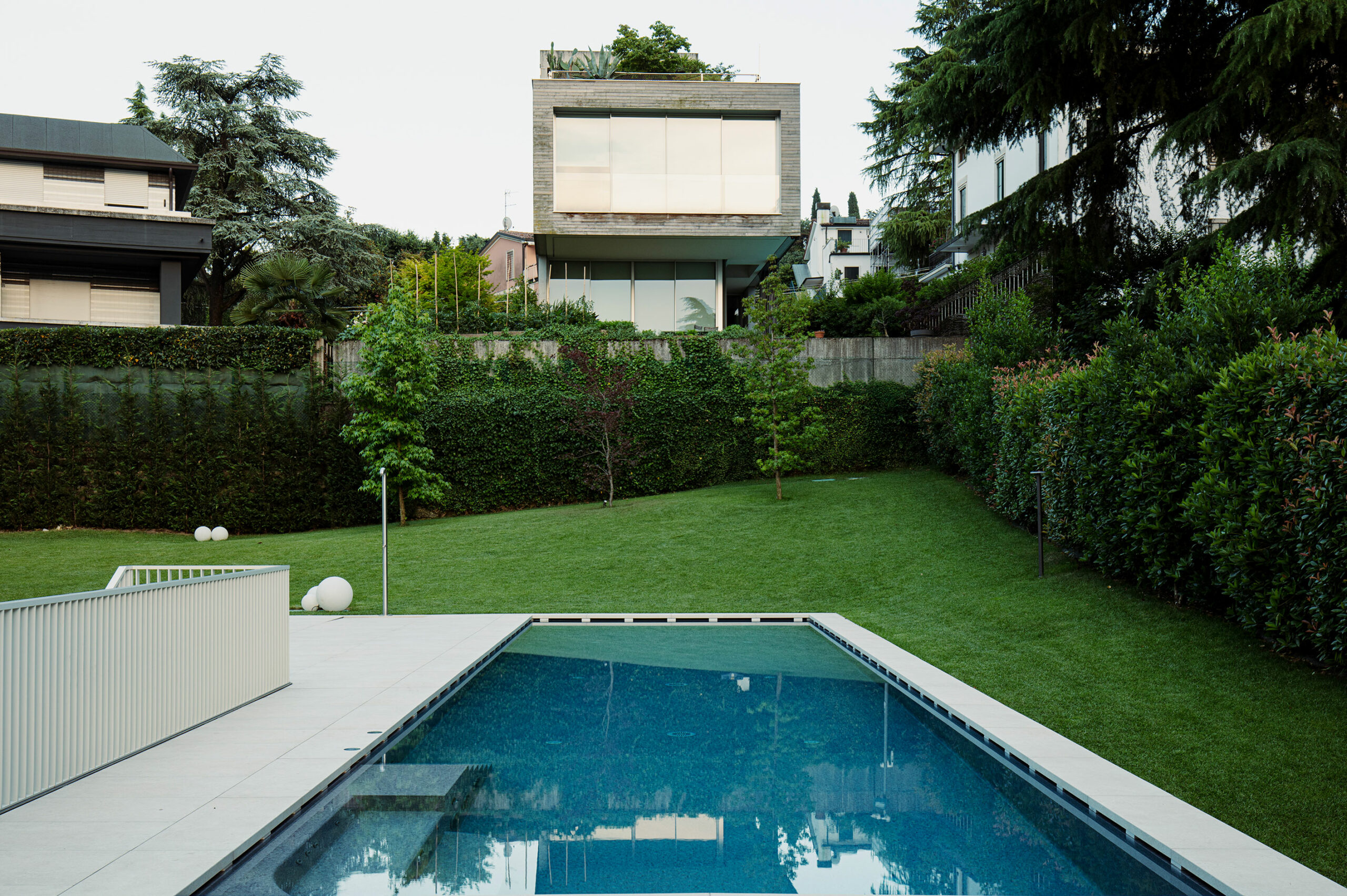 The swimming pool serves a single-family house on the hills of Monte Berico, in Vicenza. The sloping terrain allows the level difference to be used not only to position the pool in a panoramic spot but also to create additional living space beneath it. A small guest house is placed in this area, fully independent yet closely connected to the main residence. The pool naturally integrates into the hillside, while the space below provides a practical and compact solution that makes the most of the existing topography.